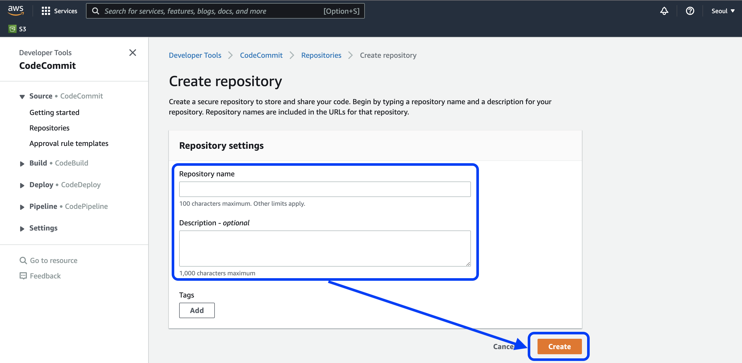 AWS 콘솔에서 CodeCommit 을 검색하면 바로 접근할 수 있다. 페이지가 이동되면 Repositories에서 Create repository를 클릭해 소스 저장소 등록으로 넘어가면 된다. 저장소 등록에는 이름과 설명을 입력한다.