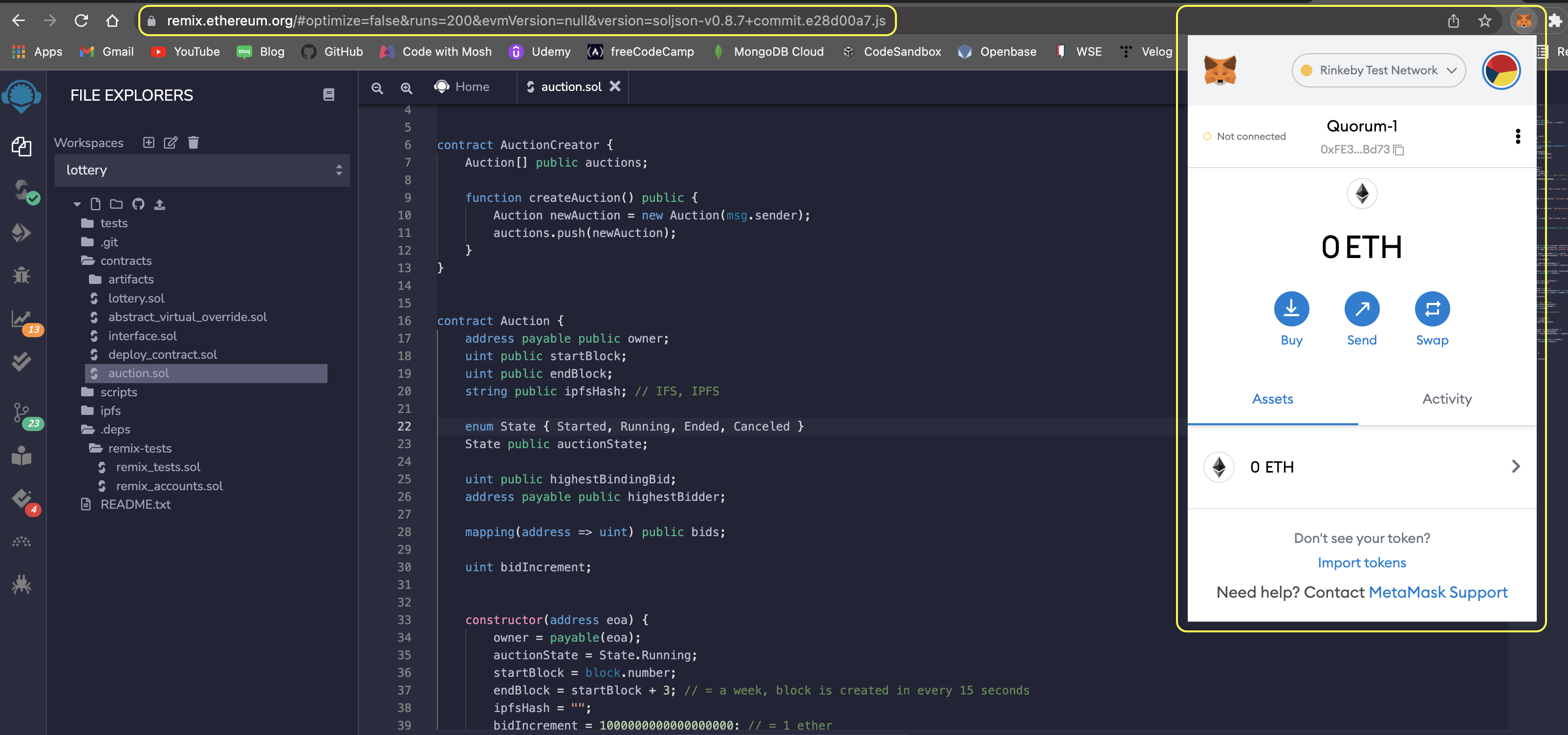 메타마스크(MetaMask) 지갑을 예시로 들어보겠다. 크롬 익스텐션 중에 메타마스크를 브라우져에 직접 연동할 수 있는 툴이 있다. 해당 익스텐션을 크롬 브라우저에 설치하면 사용자는 리믹스 에디터와 메타마스크를 연결한 뒤, 메타마스크와 연결된 이더리움 네트워크에 접근할 수 있다. 메인넷, 테스트넷, 로컬 노드 등 메타마스크 설정에 포함된 블록체인 네트워크에 사용자가 작성한 트렌젝션을 발생시키고 스마트 컨트렉트를 배포할 수 있다. 데스크탑 환경에서 불가능한 일은 아니지만 추가적인 작업을 해야한다는 점을 고려해 보았을 때, 브라우저 환경에서의 리믹스 사용은 보다 효율적이다.