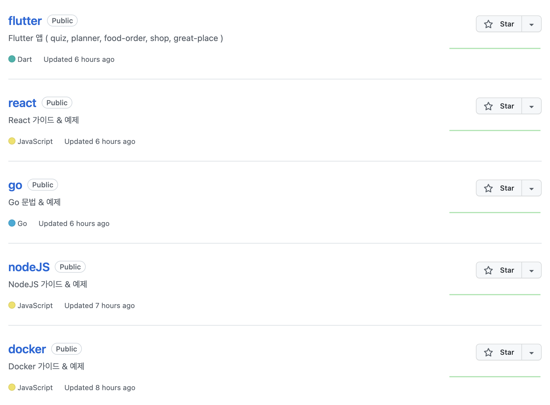 내 경우를 예로 들면, 프로그래밍 테마 별로 깃허브 저장소를 그룹화시켰다. React, NodeJS, Flutter, Go, Solidity 등의 저장소를 새로 만들고, 기존에 올려둔 저장소들을 새로 만든 저장소 내부에 매핑시켰다.